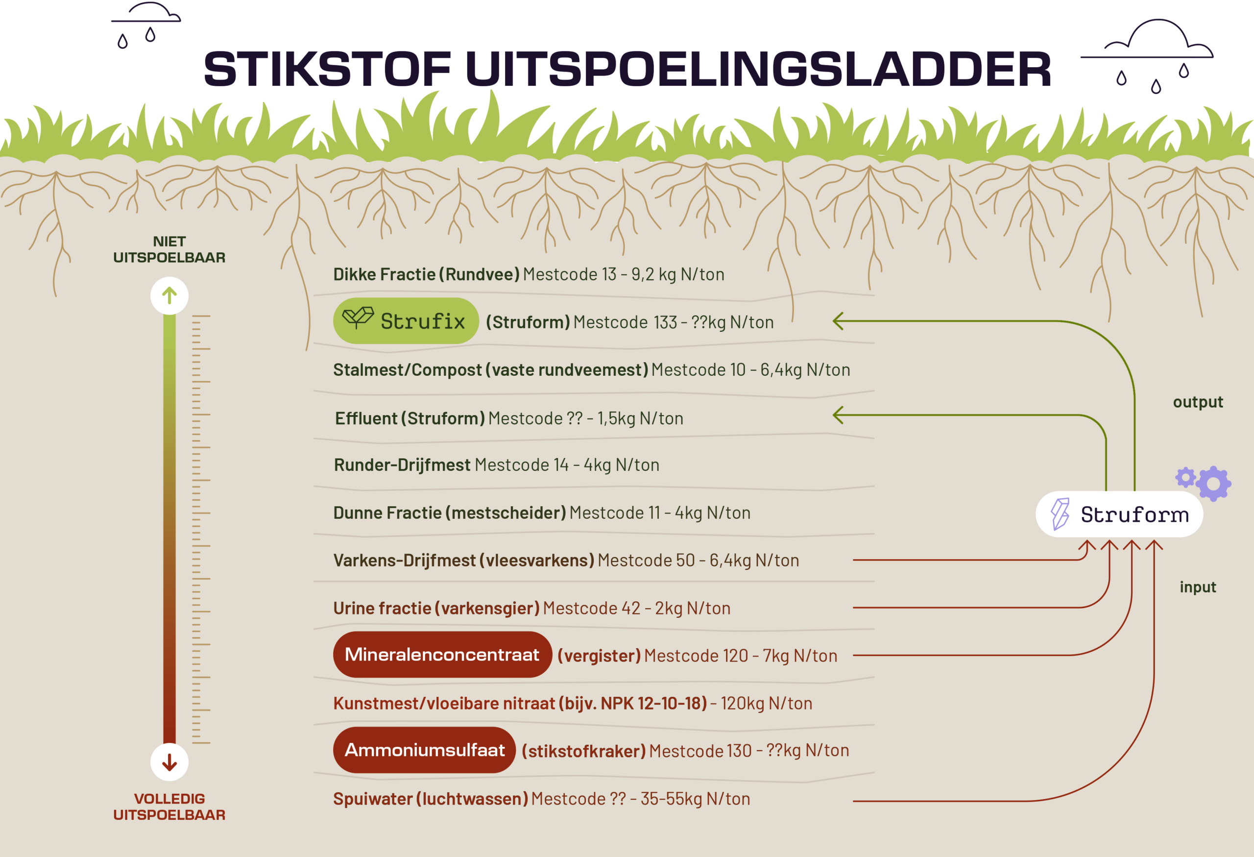 Struviet (Strufix) is door de EU erkend als RENURE-meststof. In Nederland is inmiddels mestcode 133 (RENURE) vastgesteld voor Strufix. Daarmee is de erkenning formeel geregeld. De volgende stap is het vastleggen van de nationale toepassingsregels: hoe, waar en onder welke voorwaarden het product binnen de gebruiksnormen kan worden ingezet. Strufix sluit aan bij wat beleid vraagt: een lokaal geproduceerde, CO₂-neutrale en 100% natuurlijke meststof met minimale natuur- en milieurisico’s en maximale toepasbaarheid. Omdat het pas nutriënten vrijgeeft bij opname door het gewas, spoelt het nauwelijks uit en realiseren we een forse stikstofreductie - in tegenstelling tot de twee vloeibare RENURE alternatieven. De technologie is beschikbaar, de toepassing is eenvoudig in te passen in de bestaande bedrijfsvoering en de milieuwinst is direct meetbaar. Strutec biedt daarmee een concreet en uitvoerbaar alternatief voor kunstmest, stikstofreductie en de stap naar kringlooplandbouw.